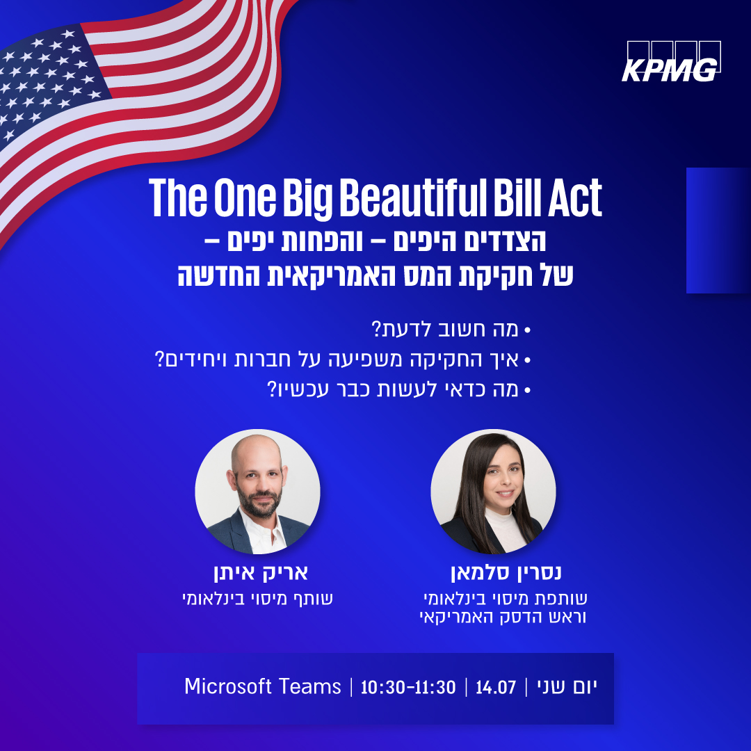©2026 כל הזכויות שמורות ל -KPMG סומך חייקין, שותפות רשומה בישראל ופירמה חברה בארגון הגלובלי של KPMG המורכב מפירמות עצמאיות המסונפות ל-KPMG International Limited, חברה אנגלית פרטית מוגבלת באחריות